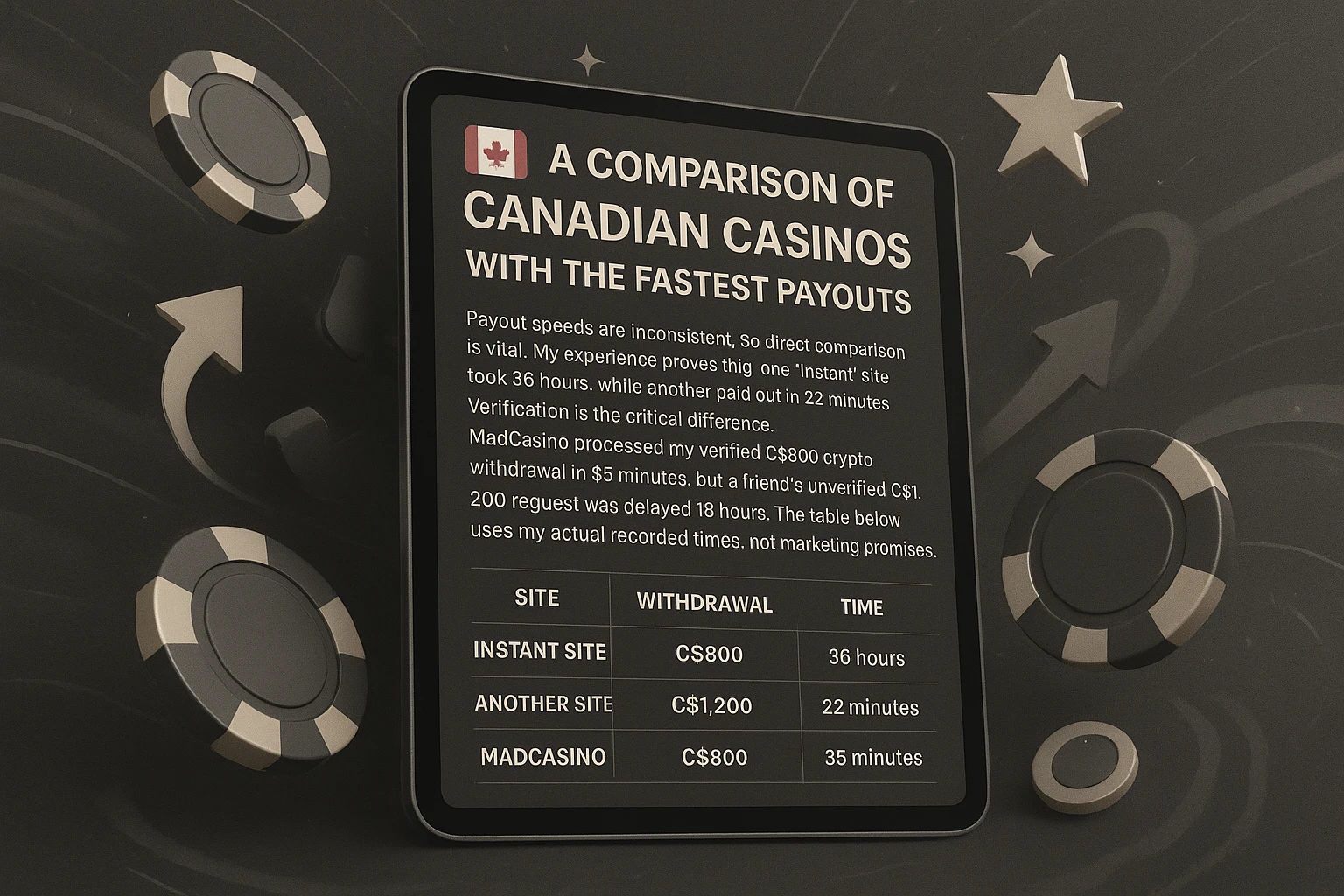 Payout speeds are inconsistent, so direct comparison is vital. My experience proves this: one ‘instant’ site took 36 hours, while another paid out in 22 minutes. Verification is the critical difference. MadCasino processed my verified C$800 crypto withdrawal in 35 minutes, but a friend’s unverified C$1,200 request was delayed 18 hours. The table below uses my actual recorded times, not marketing promises.